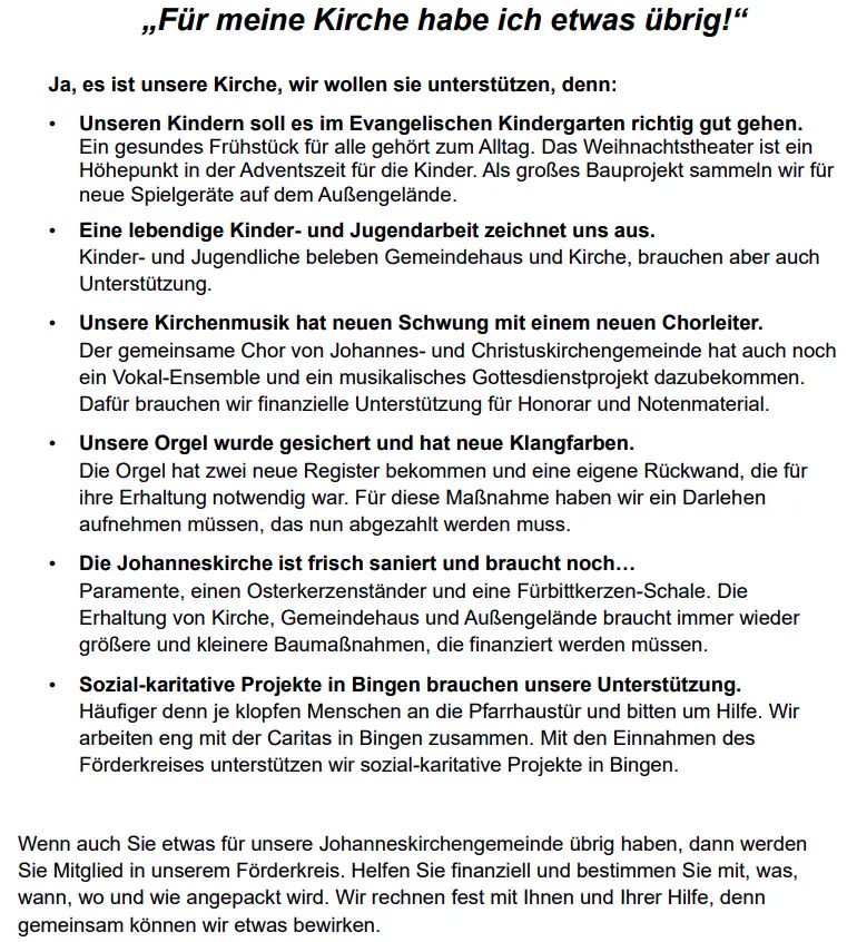 Am 21. August 2005 wurde der Förderkreis der Evangelischen Johanneskirchengemeinde Bingen e.V. gegründet. Ziel dieses Kreises ist es, die Arbeit in unserer Kirchengemeinde zu unterstützen und zu fördern.